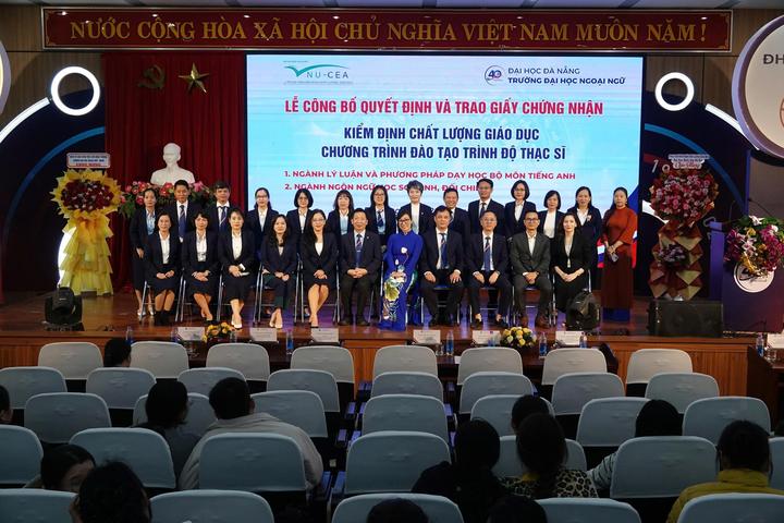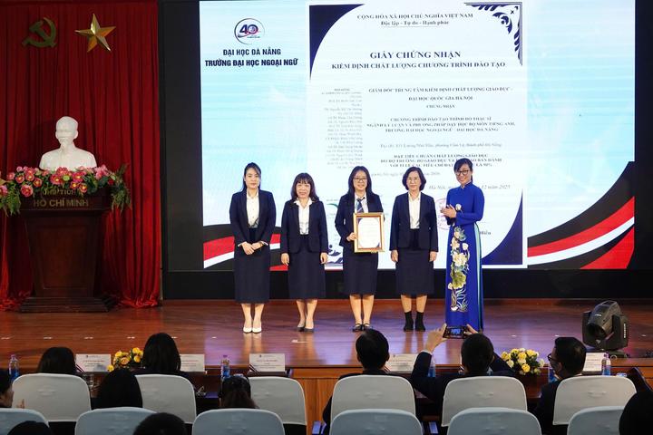 Ngày 26/12/2025, Trung tâm Kiểm định chất lượng giáo dục - Đại học Quốc gia Hà Nội (Trung tâm) phối hợp với Trường Đại học Ngoại ngữ - Đại học Đà Nẵng tổ chức công bố quyết định và trao giấy chứng nhận chương trình đào tạo (CTĐT) trình độ thạc sĩ các ngành: Lý luận và phương pháp dạy học bộ môn Tiếng Anh; Ngôn ngữ học so sánh, đối chiếu. PGS.TS. Tạ Thị Thu Hiền, Giám đốc Trung tâm tham dự và trao Giấy chứng nhận cho các CTĐT. Tham dự buổi lễ, về phía Đại học Đà Nẵng có PGS. TS Lê Thành Bắc – Phó Giám đốc; Về phía Trường Đại học Ngoại ngữ - Đại học Đà Nẵng có TS. Đào Thị Thanh Phượng, Bí thư Đảng ủy, Chủ tịch Hội đồng Trường, PGS.TS. Nguyễn Văn Long, Hiệu trưởng, cán bộ và đại biểu đại diện giảng viên, viên chức, sinh viên, người học của Nhà trường. Một số hình ảnh tại buổi Lễ: .jpg)