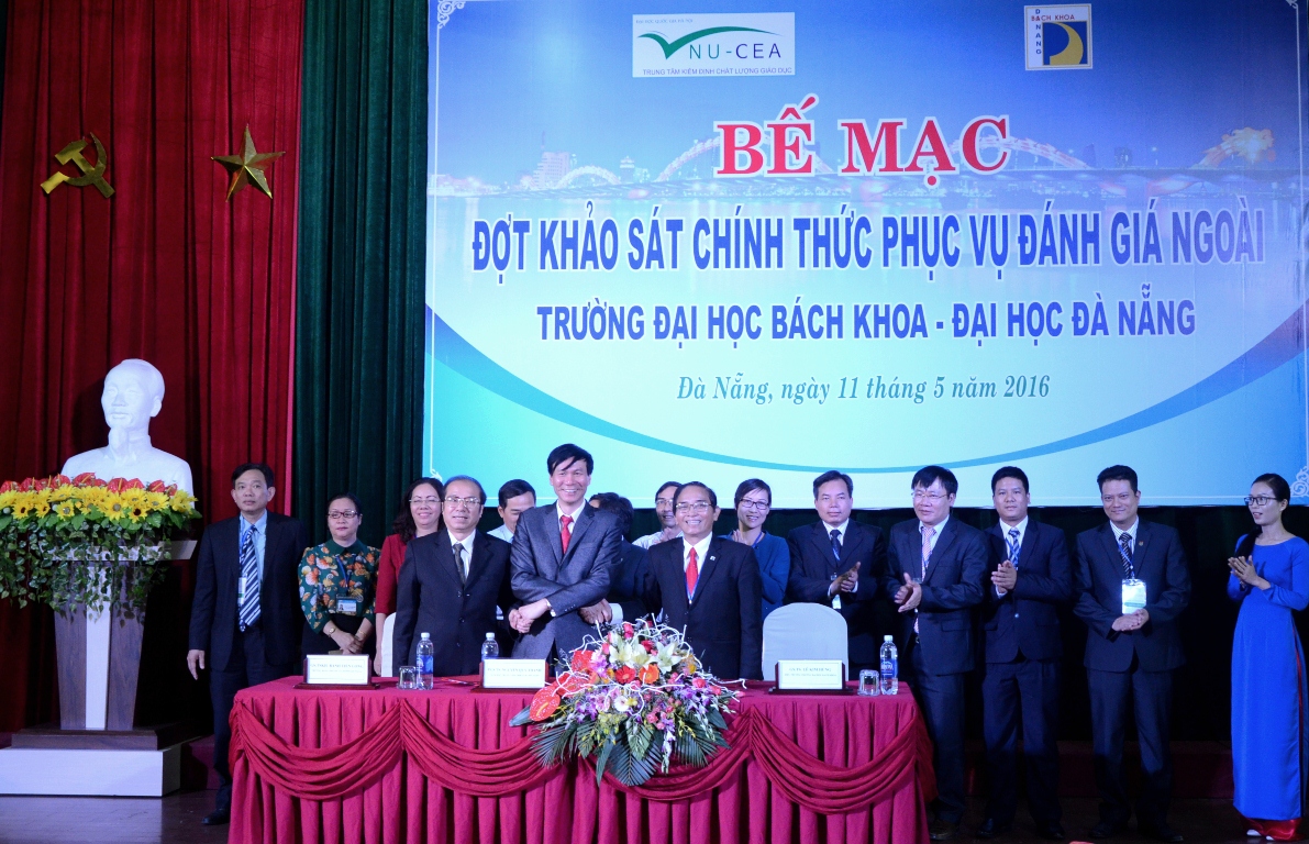 Đại diện Đoàn (GS.TSKH. Bành Tiến Long), đại diện Trung tâm Kiểm định chất lượng giáo dục ĐH Quốc gia Hà Nội (PGS.TS Nguyễn Quý Thanh, Giám đốc) và đại diện ĐH Bách khoa- ĐH vùng Đà Nẵng (GS.TS Lê Kim Hùng-Hiệu trưởng) chính thức ký biên bản hoàn thành đợt khảo sát chính thức.