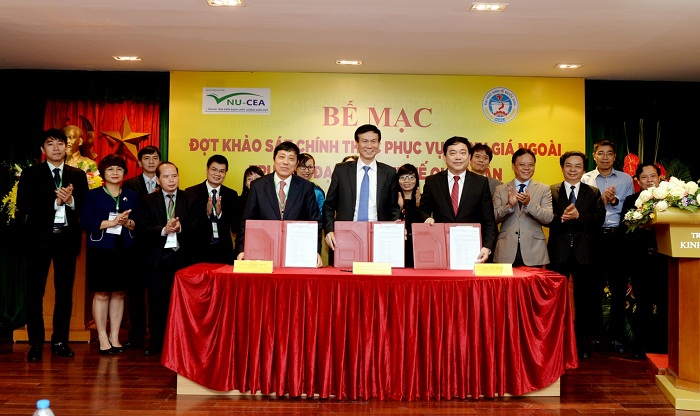 GIám đốc TTKĐCLGD-ĐHQGHN,Trưởng đoàn ĐGN và Hiệu trưởng Trường Đại học Kinh tế Quốc dân ký biên bản hoàn thành khảo sát chính thức