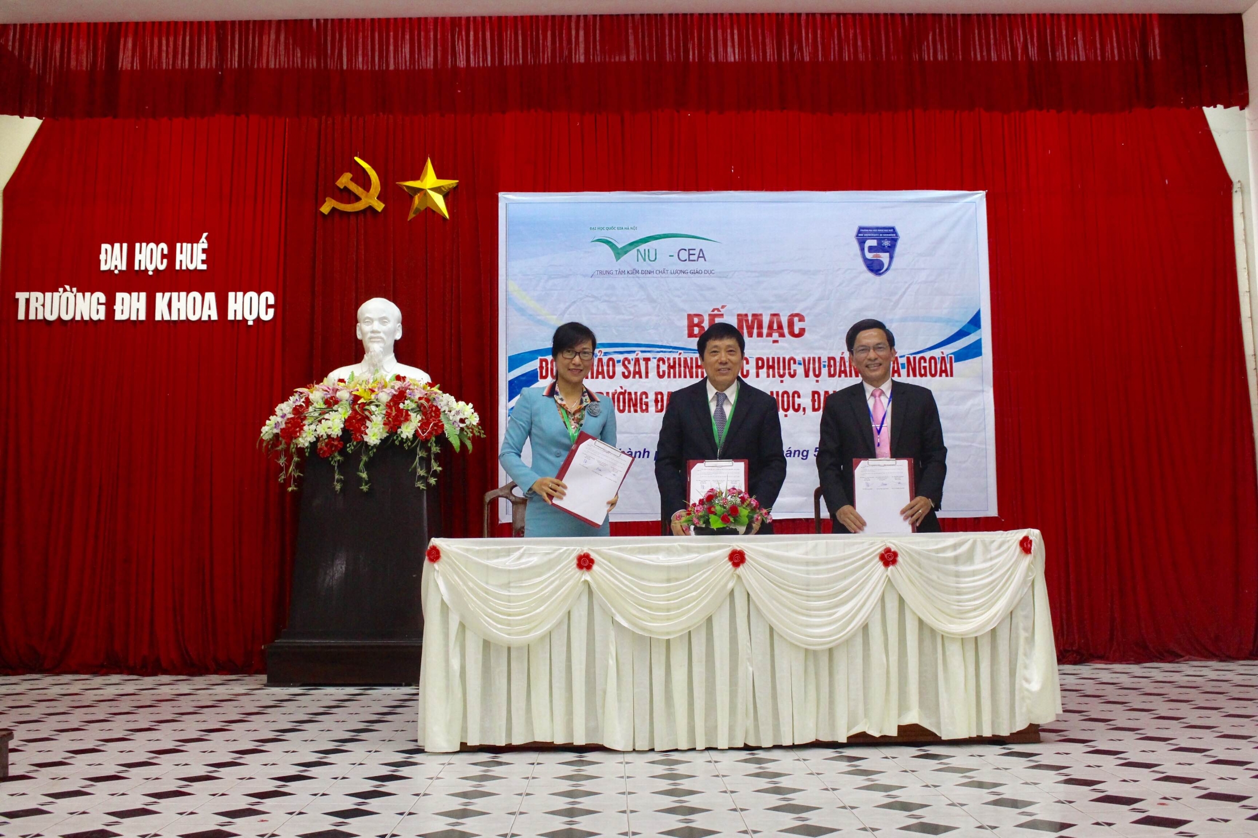 Kết thúc phiên bế mạc, Phó Giám đốc Trung tâm Kiểm định chất lượng giáo dục - Đại học Quốc gia Hà Nội, Trưởng đoàn chuyên gia đánh giá ngoài và Hiệu trưởng Trường Đại học Khoa học, Đại học Huế đã ký biên bản hoàn thành đợt khảo sát chính thức phục vụ đánh giá chất lượng Nhà trường.