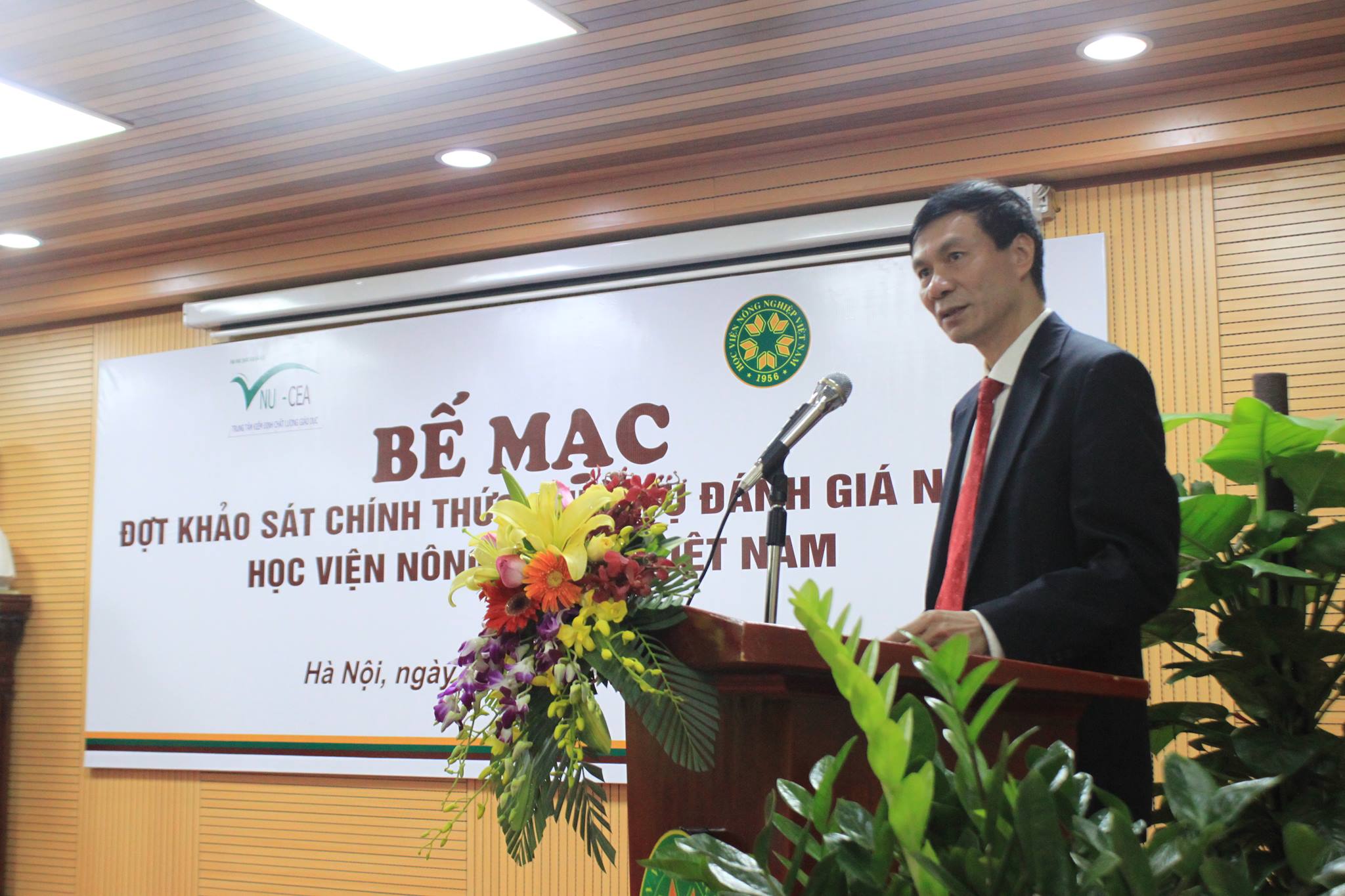 Phát biểu tại buổi bế mạc, GS.TS. Mai Trọng Nhuận, Trưởng đoàn đánh giá ngoài báo cáo sơ bộ kết quả khảo sát chính thức tại Học viện Nông nghiệp Việt Nam. Báo cáo của Đoàn đã nêu rõ những điểm mạnh và những vấn đề cần cải tiến chất lượng bám sát các tiêu chí đánh giá chất lượng trường đại học, đồng thời Đoàn cũng đưa ra các khuyến nghị để cải tiến chất lượng đối với Học viện.