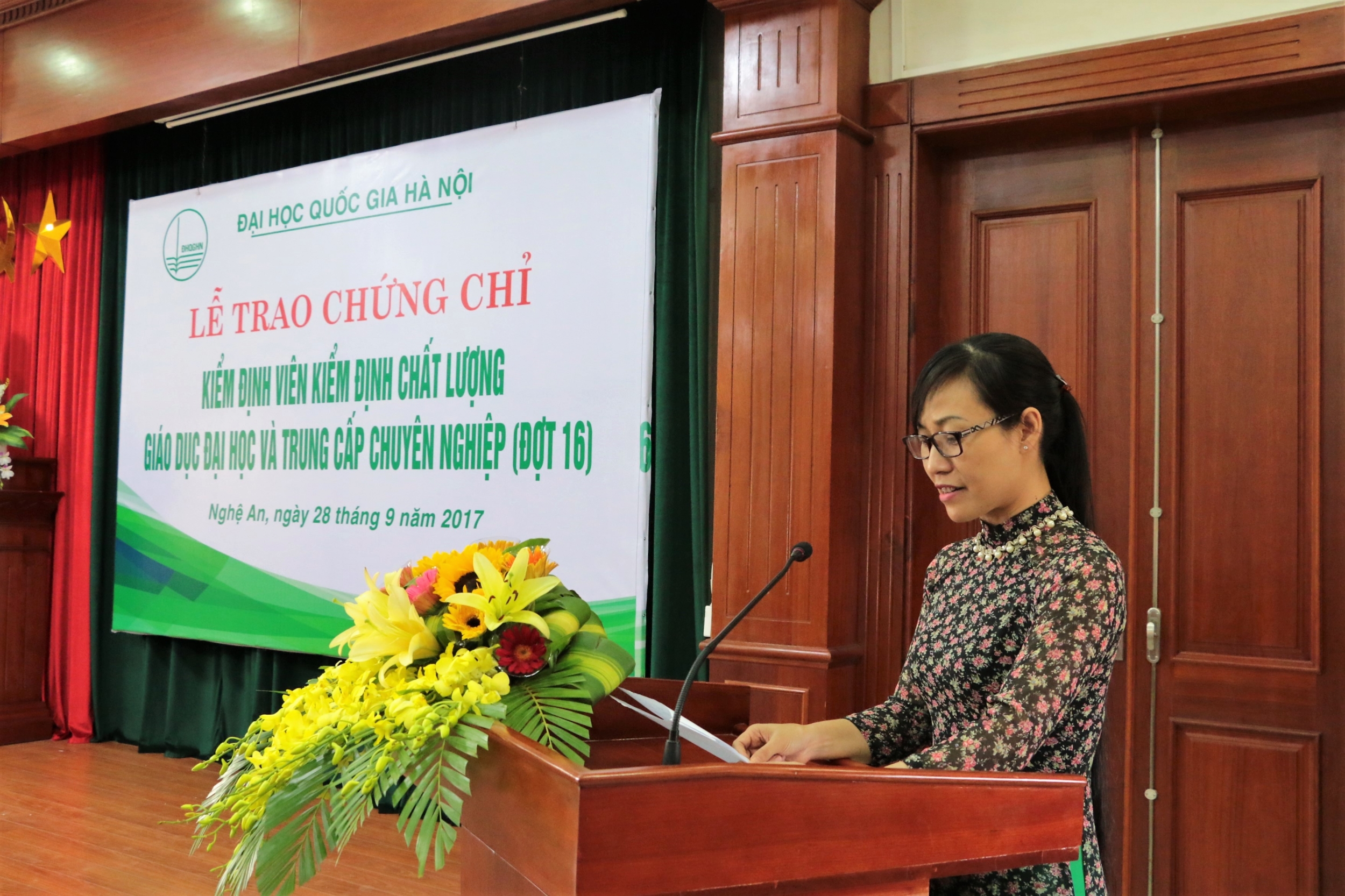 Phát biểu tại buổi lễ, TS. Tạ Thị Thu Hiền khẳng định: Đây là sự kiện quan trọng không chỉ đối với bản thân các tân kiểm định viên mà còn là sự kiện có ý nghĩa của Trường Đại học Vinh, của ĐHQGHN và của ngành giáo dục Việt Nam. TS. Tạ Thị Thu Hiền tin tưởng với những gì mà các kiểm định viên đã thu nhận được và từ những lần được tham gia đánh giá chất lượng các cơ sở giáo dục hoặc chương trình đào tạo sau này sẽ giúp ích cho các kiểm định viên trong công tác chuyên môn, góp phần thực hiện tốt công tác đảm bảo chất lượng bên trong của Nhà trường và hỗ trợ các cơ sở giáo dục khác liên tục cải tiến và nâng cao chất lượng giáo dục, góp phần đổi mới và nâng cao chất lượng đào tạo.