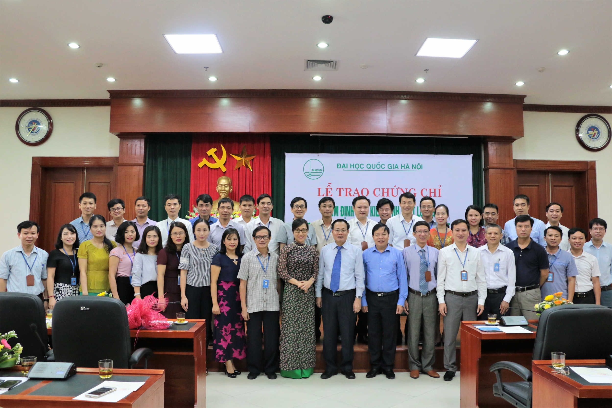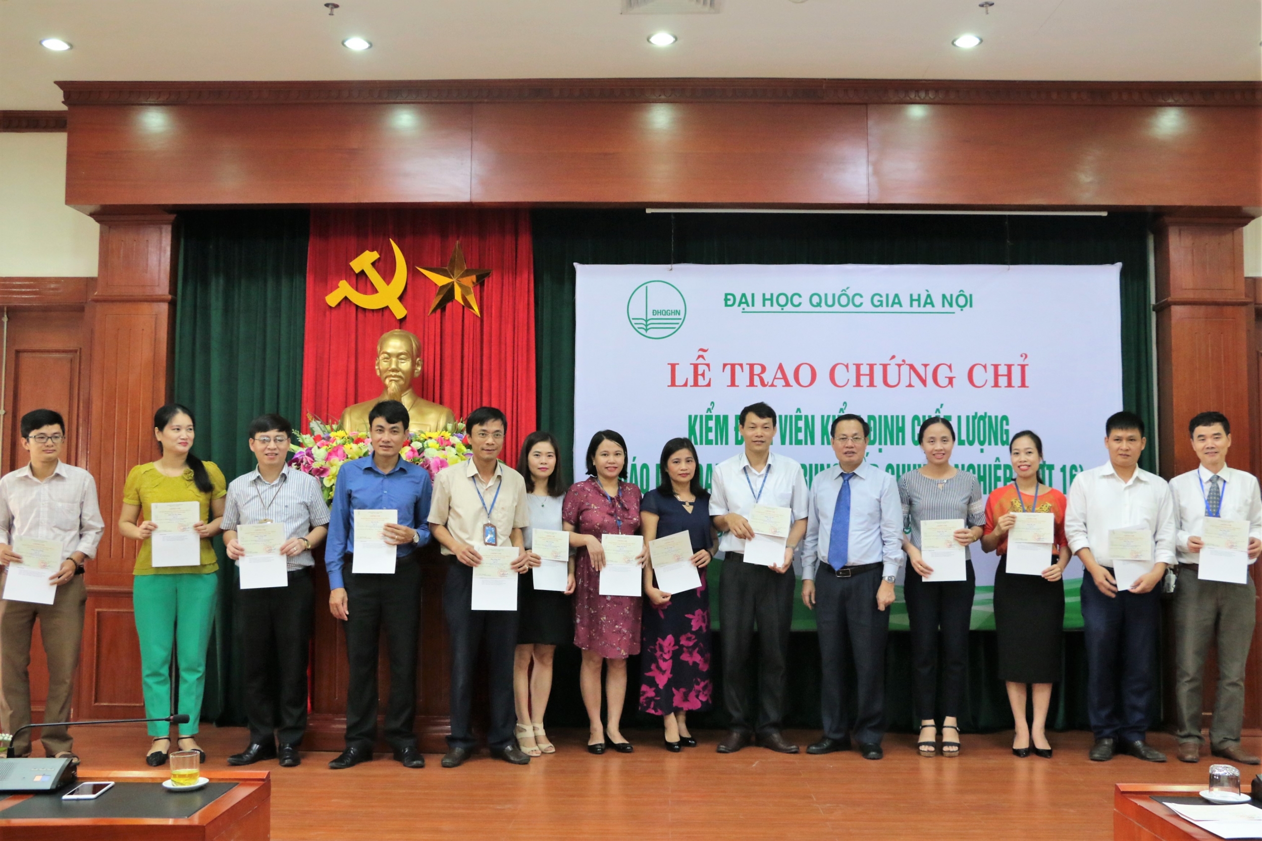 Cuối buổi lễ, Phó Giám đốc ĐHQGHN và Giám đốc Trung tâm Kiểm định chất lượng giáo dục – ĐHQGHN đã trao giấy chứng nhận cho các học viên hoàn thành khóa đào tạo kiểm định viên kiểm định chất lượng giáo dục và trung cấp chuyên nghiệp.
