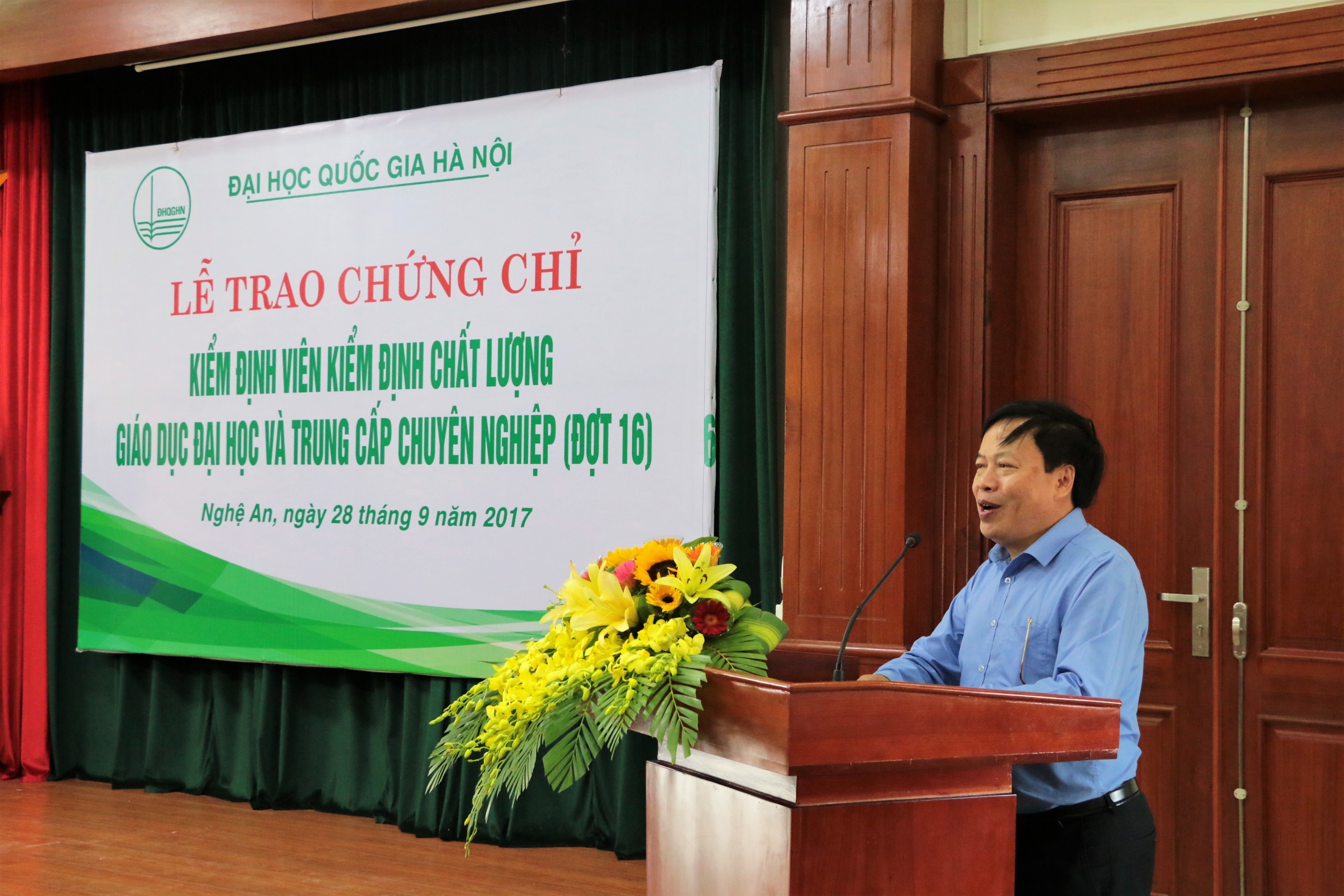Ngày 28/9/2017, Đại học Quốc gia Hà Nội (ĐHQGHN) đã phối hợp cùng Trường Đại học Vinh tổ chức lễ trao chứng chỉ kiểm định viên kiểm định chất lượng giáo dục đại học và trung cấp chuyên nghiệp dành cho 37 học viên là cán bộ lãnh đạo, quản lý, các giảng viên, chuyên viên của Trường Đại học Vinh và các cơ sở giáo dục trên cả nước.
