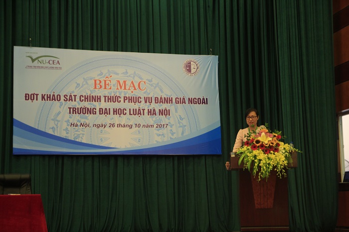 Phát biểu tại buổi bế mạc, TS. Tạ Thị Thu Hiền, Phó Giám đốc Thường trực Trung tâm KĐCLGD-ĐHQGHN một lần nữa khẳng định tầm quan trọng của công tác kiểm định chất lượng giáo dục trong việc nâng cao chất lượng của Nhà trường, đồng thời đánh giá cao tinh thần làm việc đầy trách nhiệm và trí tuệ của các thành viên Đoàn chuyên gia ĐGN trong quá trình nghiên cứu hồ sơ minh chứng, khảo sát sơ bộ và khảo sát chính thức để đưa ra những nhận định, đánh giá và khuyến nghị cải tiến chất lượng đối với Nhà trường. Phó Giám đốc cũng cám ơn Trường ĐH Luật Hà Nội đã hỗ trợ, tạo điều kiện và đáp ứng các yêu cầu cung cấp thông tin, minh chứng phục vụ cho quá trình đánh giá của Đoàn.
