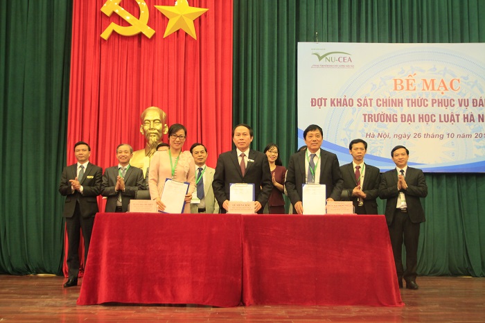 Đại diện lãnh đạo Trung tâm KĐCLGD-ĐHQGHN, Trưởng Đoàn chuyên gia ĐGN và Hiệu trưởng Trường ĐH Luật Hà Nội ký biên bản hoàn thành đợt khảo sát chính thức