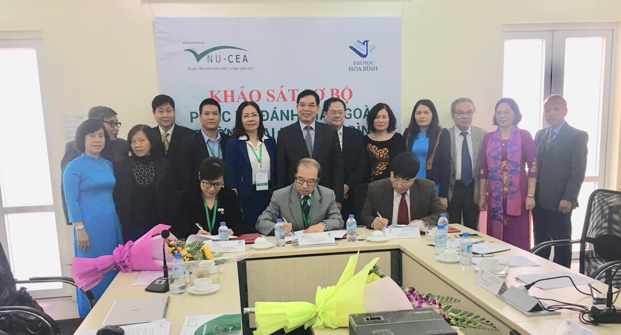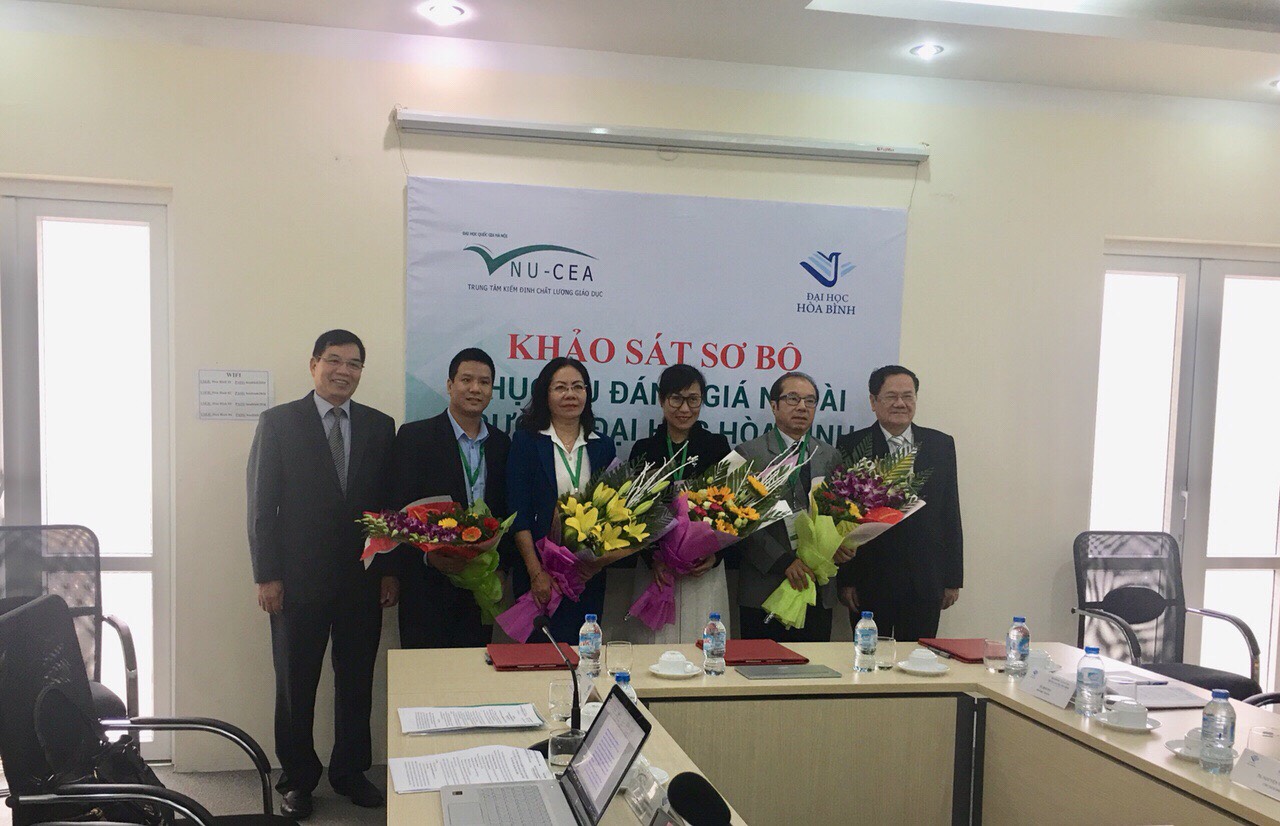 Sáng ngày 19/11/2017, Đoàn chuyên gia đánh giá ngoài (ĐGN) của Trung tâm Kiểm định chất lượng giáo dục - Đại học Quốc gia Hà Nội (KĐCLGD – ĐHQGHN) đã tiến hành khảo sát sơ bộ tại Trường ĐH Hòa Bình để chuẩn bị cho đợt khảo sát chính thức Nhà trường theo quy trình đánh giá chất lượng trường đại học của Bộ Giáo dục và Đào tạo.