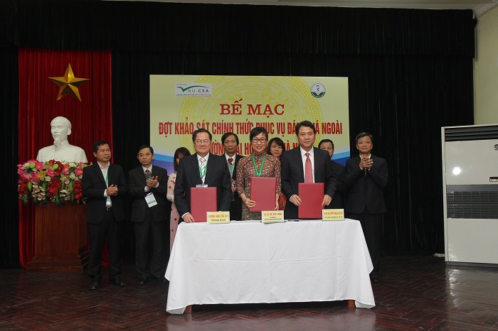 Đại diện lãnh đạo Trung tâm KĐCLGD-ĐHQGHN, Trưởng Đoàn chuyên gia ĐGN và Phó Hiệu trưởng Trường ĐH Dược Hà Nội ký biên bản hoàn thành đợt khảo sát chính thức