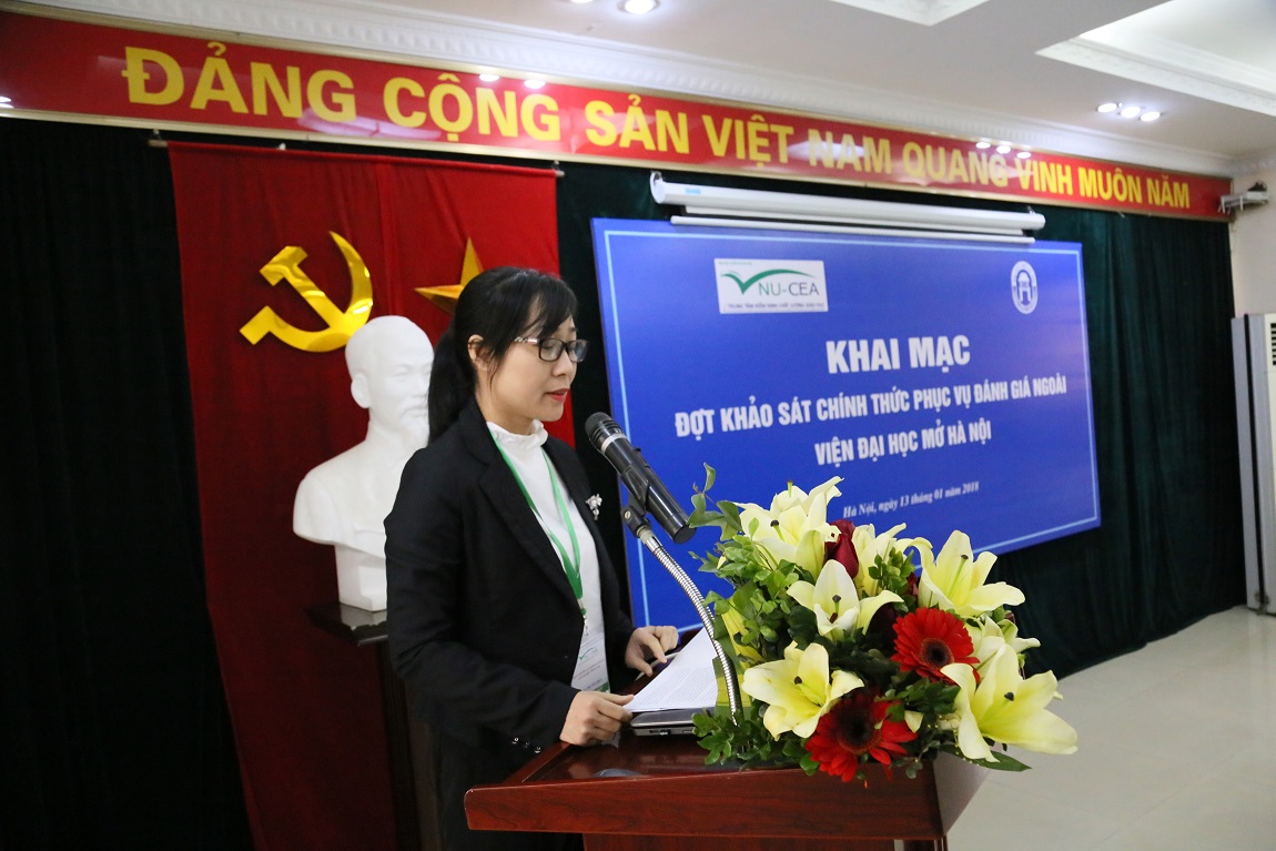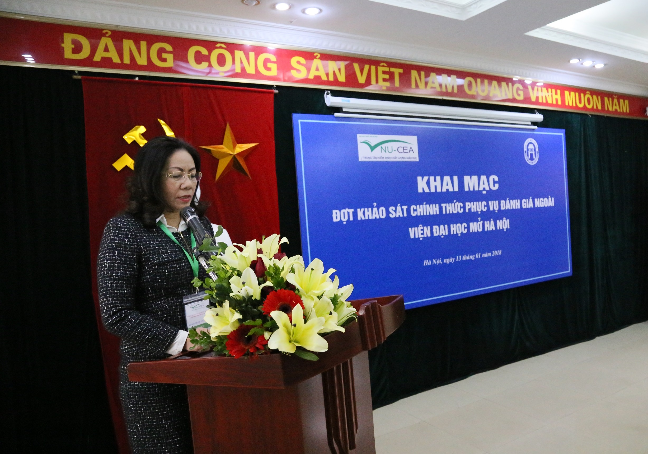 Phát biểu tại buổi Khai mạc, TS. Tạ Thị Thu Hiền, Phó Giám đốc phụ trách Trung tâm khẳng định tầm quan trọng của việc đánh giá ngoài; khẳng định mục đích chính của kiểm định chất lượng giáo dục là nhằm đảm bảo đạt được những chuẩn mực nhất định trong đào tạo và không ngừng cải tiến, nâng cao chất lượng đào tạo, đáp ứng yêu cầu của người sử dụng nguồn nhân lực và đảm bảo quyền lợi cho người học. Phó Giám đốc cũng đánh giá cao sự phối hợp chặt chẽ của Viện Đại học Mở Hà Nội với Trung tâm KĐCLGD-ĐHQGHN trong quá trình chuẩn bị cho đợt khảo sát chính thức và đề nghị Viện tiếp tục hỗ trợ Đoàn chuyên gia đánh giá ngoài trong quá trình triển khai các hoạt động KĐCLGD. Đồng thời, Phó Giám đốc đề nghị Đoàn chuyên gia đánh giá ngoài thực hiện các hoạt động đánh giá khách quan, trung thực, công bằng.