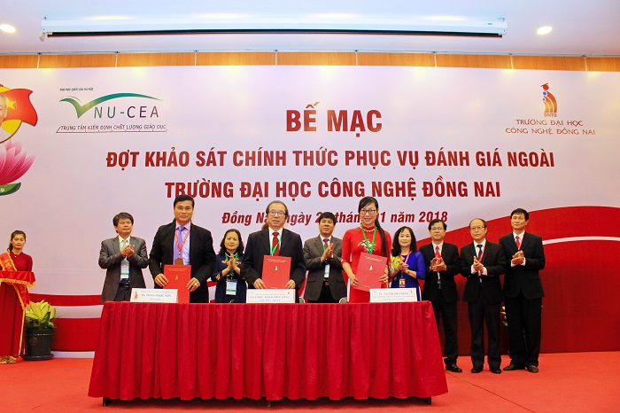 Kết thúc buổi bế mạc, Phó Giám đốc phụ trách Trung tâm KĐCLGD-ĐHQGHN, Trưởng Đoàn chuyên gia ĐGN và Hiệu trưởng Trường Đại học Công nghệ Đồng Nai đã ký biên bản hoàn thành đợt khảo sát chính thức phục vụ đánh giá chất lượng Nhà trường.