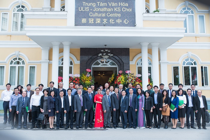 Giám đốc ĐHQGHN Nguyễn Kim Sơn và Cục trưởng Cục Quản lý chất lương Mai Văn Trinh tặng hoa chúc mừng tân Giám đốc Trung tâm
