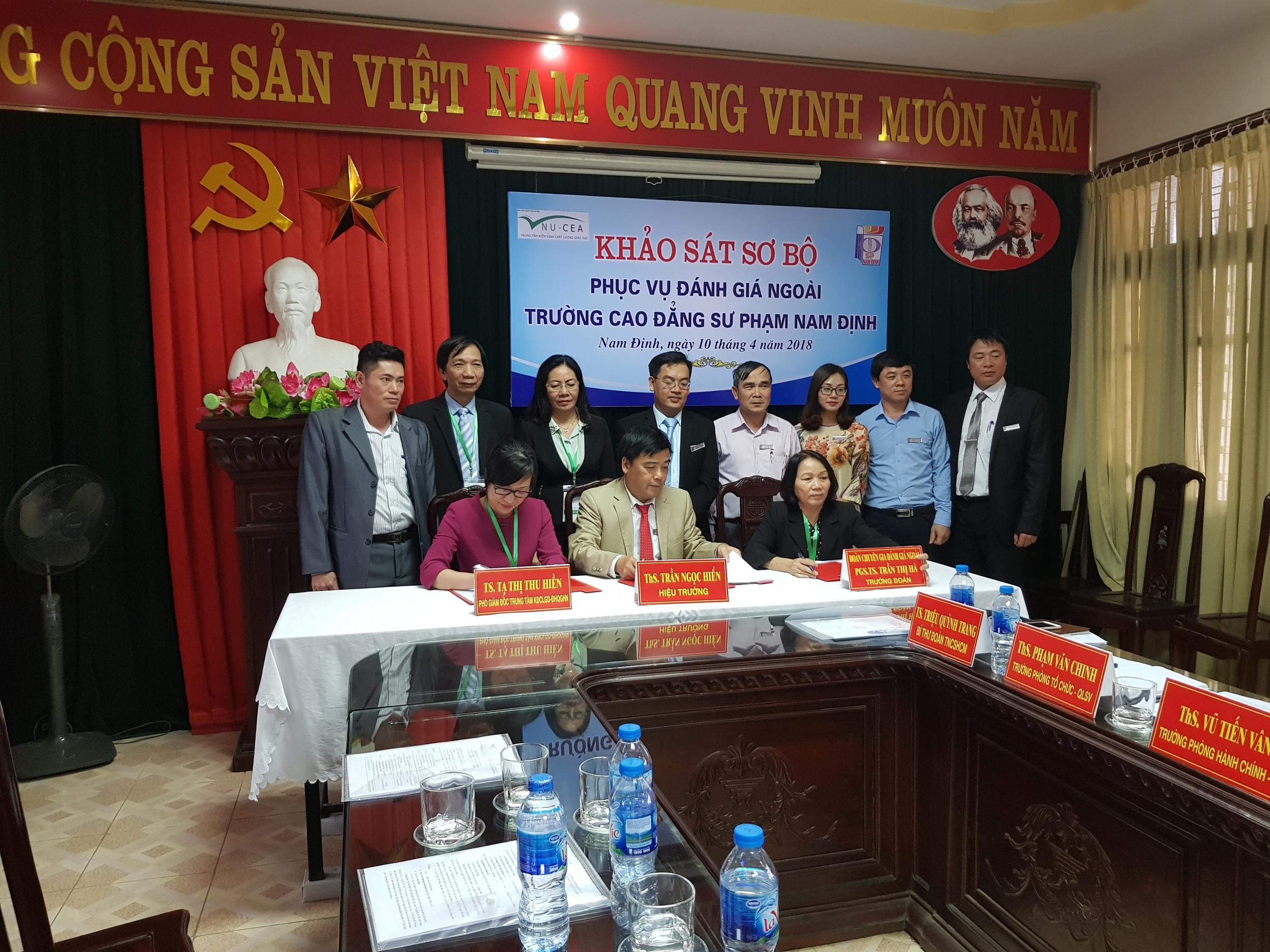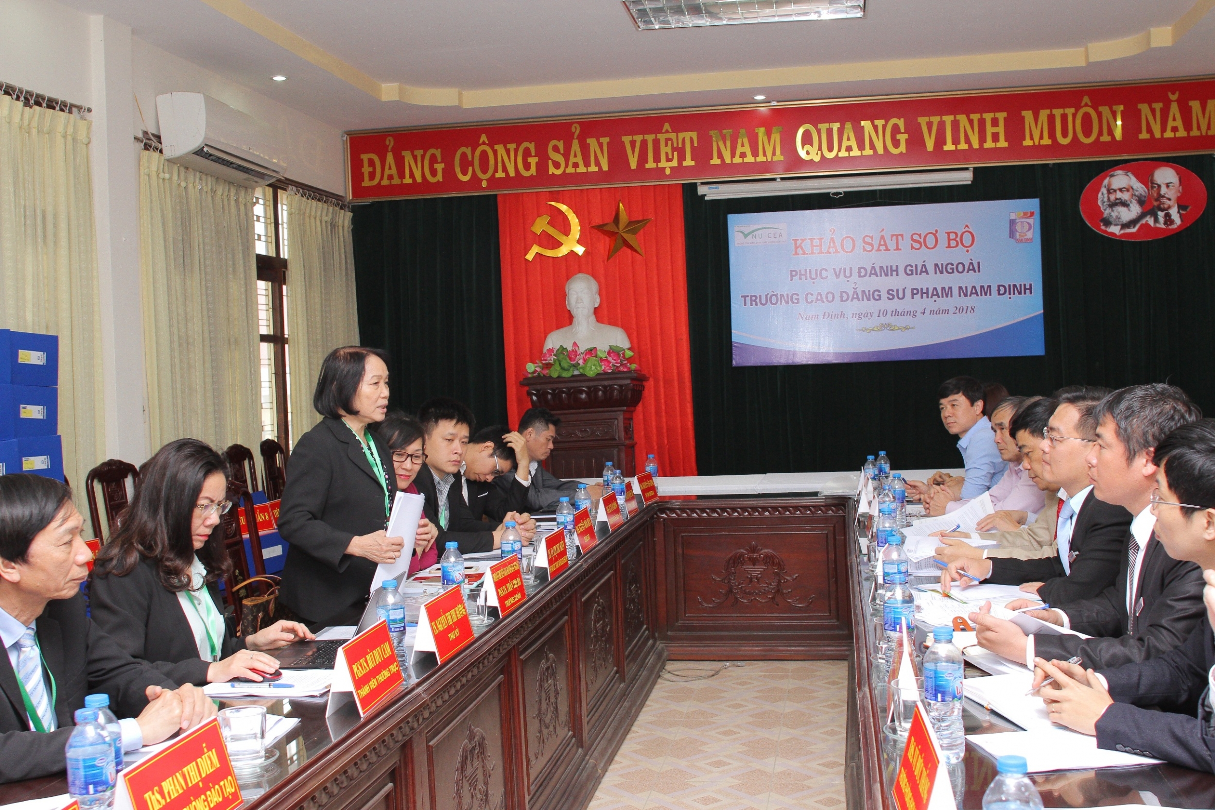 Chiều ngày 10/4/2018, Đoàn chuyên gia đánh giá ngoài (ĐGN) của Trung tâm Kiểm định chất lượng giáo dục - Đại học Quốc gia Hà Nội (KĐCLGD - ĐHQGHN) đã tiến hành khảo sát sơ bộ tại Trường Cao đẳng Sư phạm Nam Định để chuẩn bị cho đợt khảo sát chính thức Nhà trường theo quy định của Bộ Giáo dục và Đào tạo.