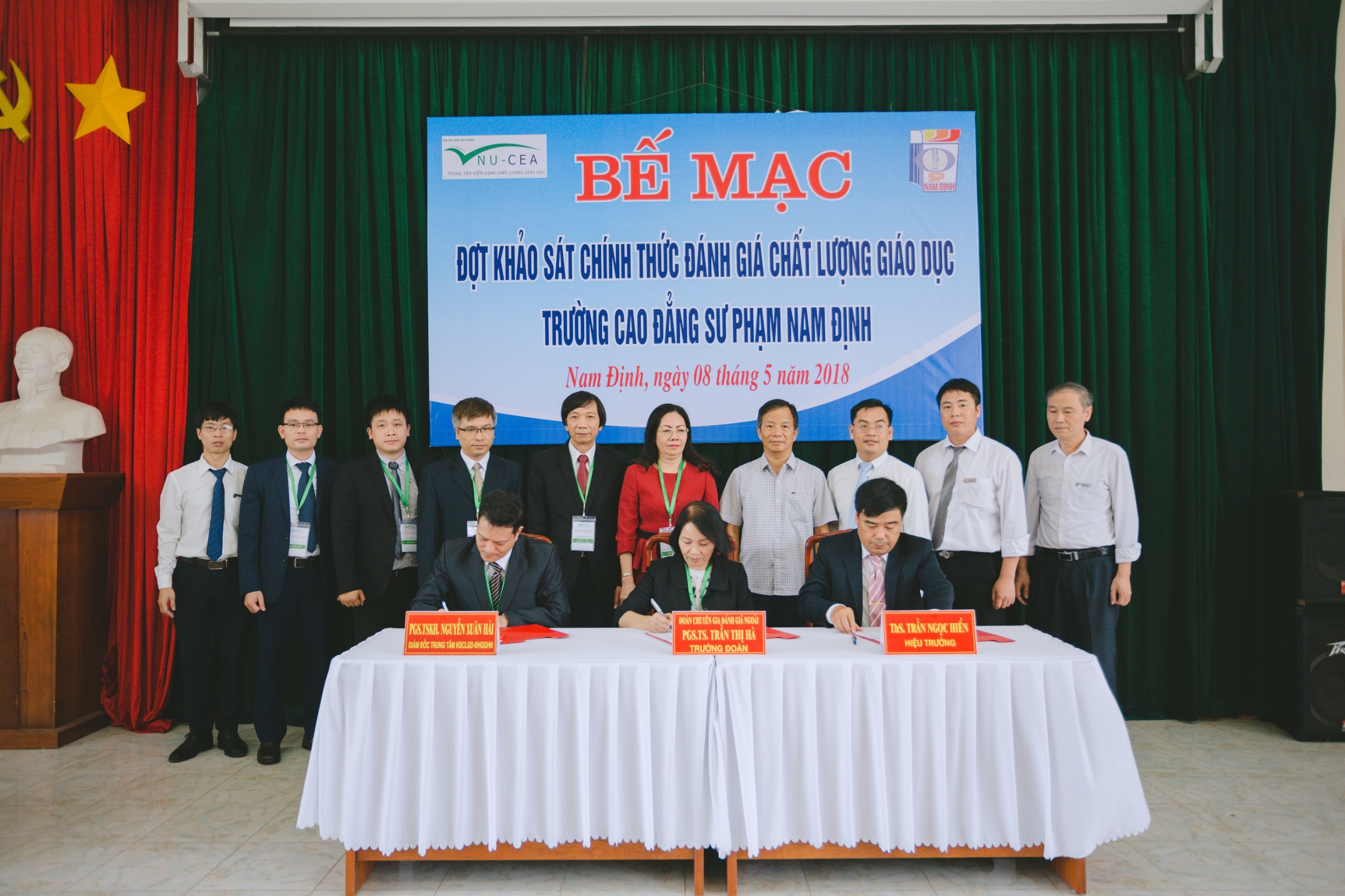 Kết thúc buổi bế mạc, Giám đốc Trung tâm KĐCLGD-ĐHQGHN, Trưởng Đoàn chuyên gia ĐGN và Hiệu trưởng Trường Cao đẳng Sư phạm Nam Định đã ký biên bản hoàn thành đợt khảo sát chính thức phục vụ đánh giá chất lượng Nhà trường.