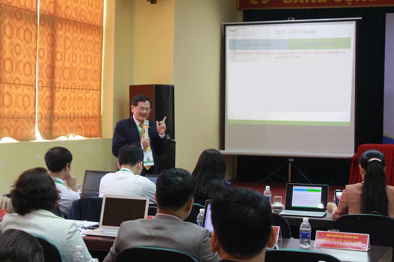Báo cáo tại phiên bế mạc, GS.TSKH. Đặng Ứng Vận - Trưởng đoàn và TS. Nguyễn Thị Thu Hương – Thư ký Đoàn Chuyên gia đánh giá ngoài đã trình bày các nguyên tắc, quan điểm đánh giá chất lượng chương trình đào tạo và các nội dung chủ yếu liên quan đến kết quả đánh giá 2 Chương trình như: chương trình đào tạo, hoạt động dạy - học, đội ngũ giảng viên và nhân viên, người học, cơ sở vật chất, việc nâng cao chất lượng và quản trị kết quả đầu ra v.v. Đoàn chuyên gia đánh giá ngoài đã đưa ra các khuyến nghị để Lãnh đạo Nhà trường cũng như các Khoa Giáo dục tiểu học, Ngoại ngữ tiếp tục cải tiến, nâng cao chất lượng đào tạo, đáp ứng yêu cầu của nhà sử dụng, của các bên liên quan và đảm bảo quyền lợi cho người học.