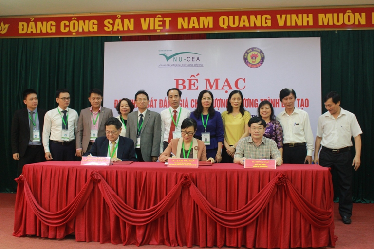 Kết thúc phiên bế mạc, TS. Tạ Thị Thu Hiền - Phó Giám đốc phụ trách Trung tâm, GS.TSKH. Đặng Ứng Vận - Trưởng đoàn Chuyên gia đánh giá ngoài và TS. Hoàng Nam - Quyền Hiệu trưởng Nhà trường đã ký kết biên bản hoàn thành đợt khảo sát chính thức đánh giá chất lượng 2 chương trình đào tạo của Trường Đại học Hồng Đức.