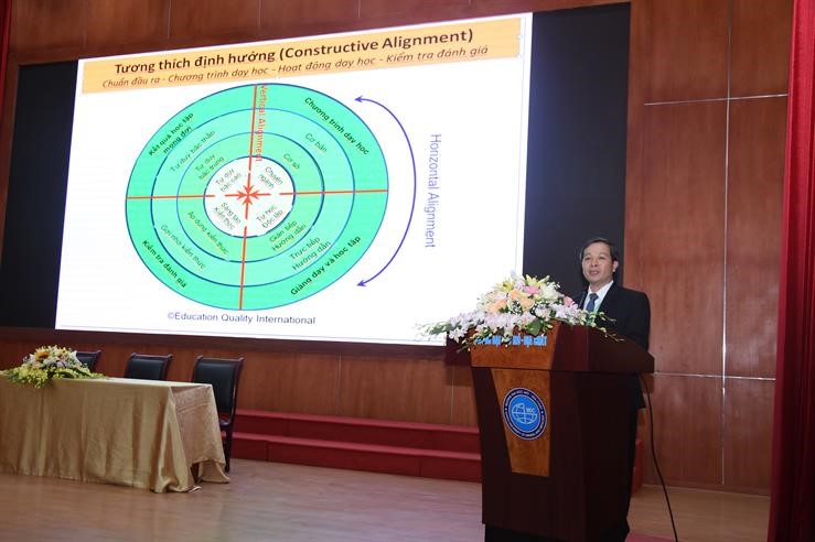 Báo cáo tại phiên bế mạc, GS.TS.NGND. Nguyễn Hữu Đức - Trưởng đoàn, TS. Nguyễn Thị Thu Hương - Thư ký Đoàn và PGS.TS. Ngô Văn Thuyên – Thành viên Đoàn Chuyên gia đánh giá ngoài đã trình bày các nguyên tắc, quan điểm đánh giá chất lượng chương trình đào tạo và các nội dung chủ yếu liên quan đến kết quả đánh giá 04 Chương trình như: chương trình đào tạo, hoạt động dạy - học, đội ngũ giảng viên và nhân viên, người học, cơ sở vật chất, việc nâng cao chất lượng và quản trị kết quả đầu ra v.v. Đoàn chuyên gia đánh giá ngoài đã đưa ra các khuyến nghị để Lãnh đạo Nhà trường cũng như các Khoa: Khoa học và Kỹ thuật Địa chất, Khoa Kinh tế - Quản trị kinh doanh và Khoa Cơ - Điện tiếp tục cải tiến, nâng cao chất lượng các CTĐT, đáp ứng yêu cầu của nhà sử dụng, của các bên liên quan và đảm bảo quyền lợi cho người học.