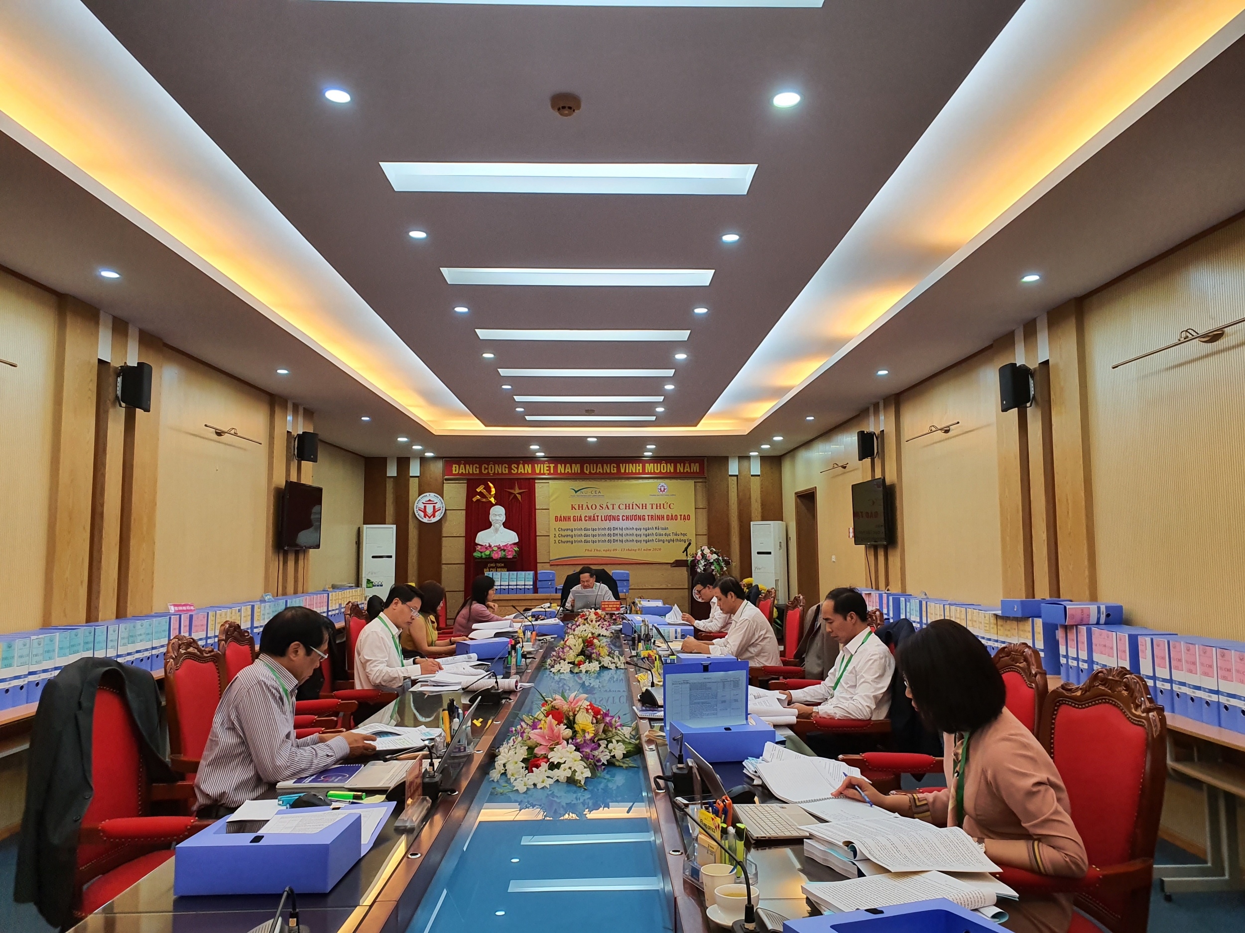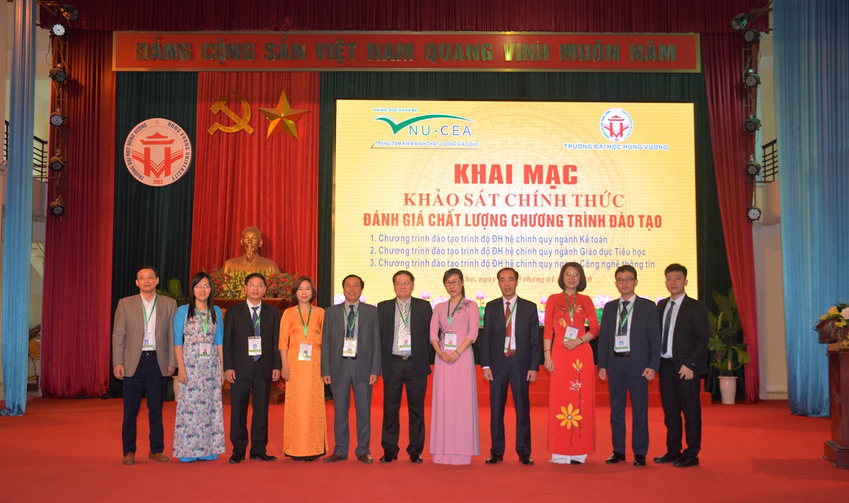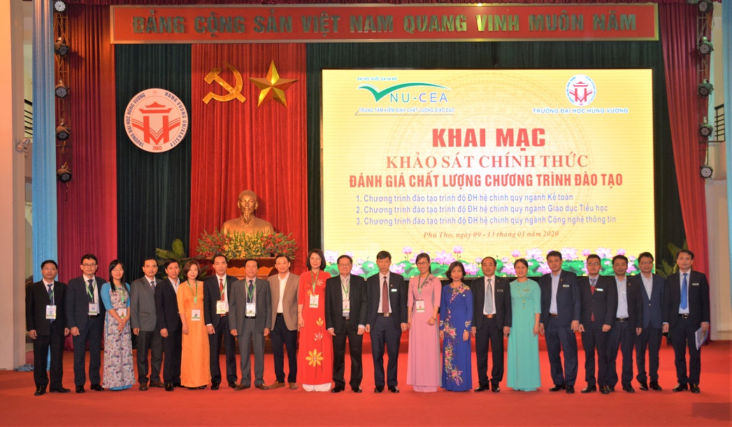 Sáng ngày 09/01/2020, Trung tâm Kiểm định chất lượng giáo dục - Đại học Quốc gia Hà Nội (KĐCLGD-ĐHQGHN) đã phối hợp với Trường Đại học Hùng Vương tổ chức khai mạc đợt khảo sát chính thức đánh giá chất lượng 03 chương trình đào tạo chính quy trình độ đại học (ngành Kế toán, ngành Giáo dục tiểu học và ngành Công nghệ thông tin) theo bộ tiêu chuẩn đánh giá chất lượng chương trình đào tạo ban hành theo Thông tư số 04/2016/TT-BGDĐT ngày 14/3/2016 của Bộ Giáo dục và Đào tạo.