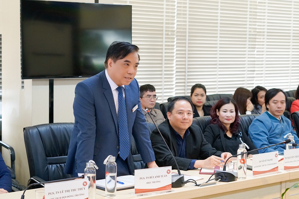 PGS.TS. Bùi Anh Tuấn - Hiệu trưởng Nhà Trường - Chủ tịch Hội đồng Tự đánh giá Đại diện Lãnh đạo Trường Đại học Ngoại thương đã trình bày tóm tắt quá trình tự đánh giá các chương trình đào tạo của nhà trường và bày tỏ cam kết của nhà trường chuẩn bị tốt nhất hồ sơ, minh chứng và các điều kiện cho đợt khảo sát chính thức của Đoàn tại Trường.