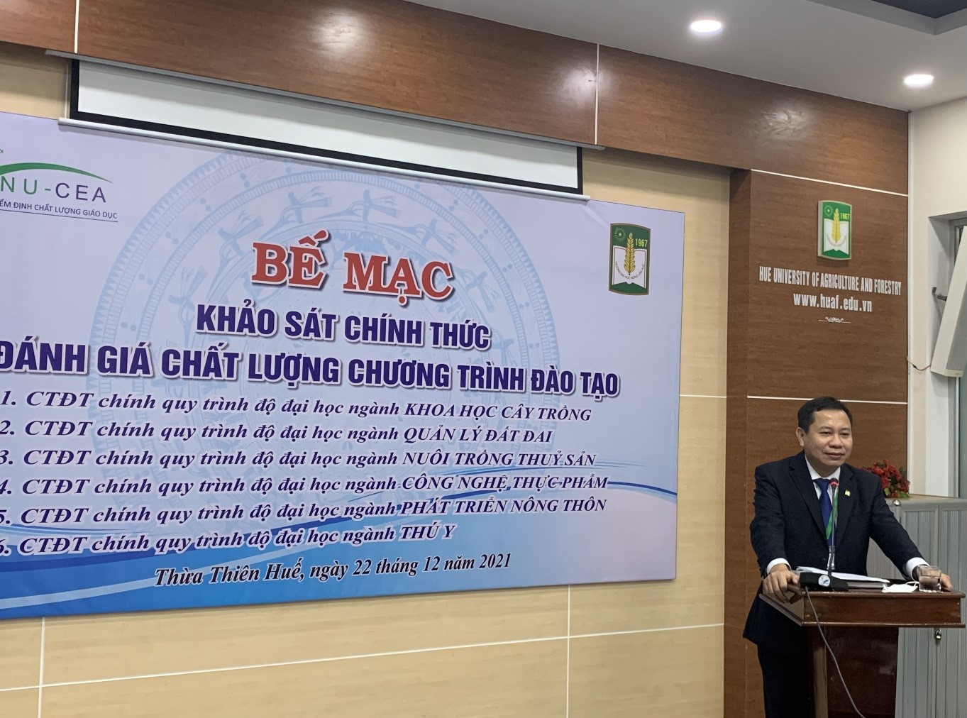 Chiều ngày 22/12/2021, Trung tâm kiểm định chất lượng giáo dục – Đại học Quốc gia Hà Nội (KĐCLGD-ĐHQGHN) phối hợp với trường Đại học Nông Lâm, Đại học Huế (ĐHNL) tổ chức bế mạc đợt khảo sát chính thức đánh giá ngoài (ĐGN) 06 chương trình đào tạo chính quy trình độ đại học (CTĐT) các ngành: Khoa học cây trồng, Quản lý đất đai, Nuôi trồng thủy sản, Công nghệ thực phẩm, Thú y, Phát triển nông thôn.