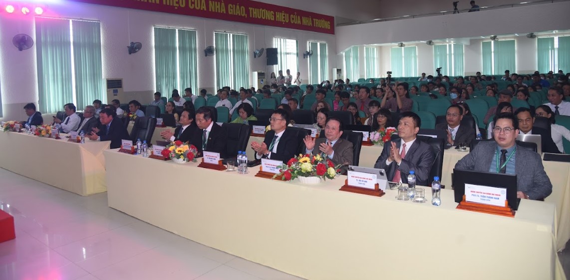 có: TS. Trương Tấn Đạt - Bí thư Đảng ủy, Chủ tịch Hội đồng trường; TS. Hồ Văn Thống - Hiệu trưởng Nhà trường, các thành viên trong Ban Giám