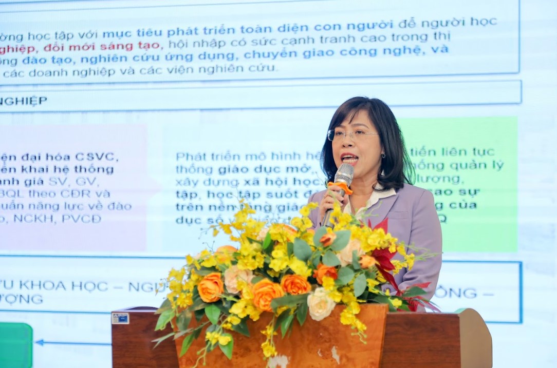 Tại phiên khai mạc, TS. Trần Ái Cầm - Hiệu trưởng Nhà trường đã trình bày báo cáo tổng quan về các CTĐT, kết quả tự đánh giá và các