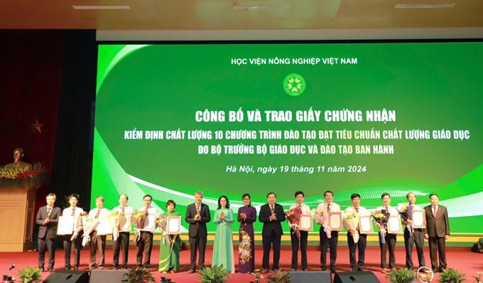 Ngày 19/11/2024, Trung tâm Kiểm định chất lượng giáo dục - Đại học Quốc gia Hà Nội (Trung tâm) phối hợp với Học viện Nông nghiệp Việt Nam (Học viện) tổ chức công bố quyết định và trao giấy chứng nhận Kiểm định chất lượng cho 10 chương trình đào tạo chính quy trình độ đại học (CTĐT) các ngành: Công nghệ kỹ thuật ô tô; Công nghệ kỹ thuật cơ điện tử; Công nghệ thông tin; Công nghệ và kinh doanh thực phẩm; Kinh tế đầu tư; Ngôn ngữ Anh; Nông nghiệp công nghệ cao; Nuôi trồng thủy sản; Quản lý đất đai; Xã hội học.