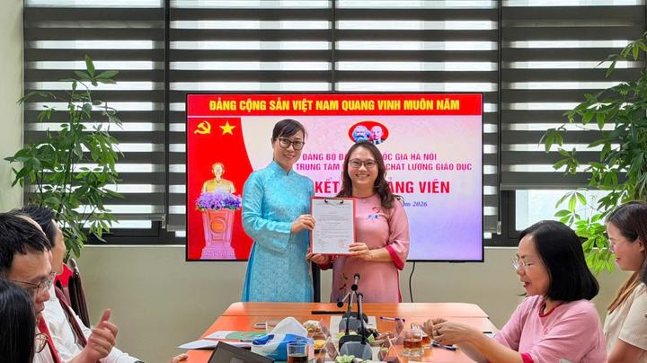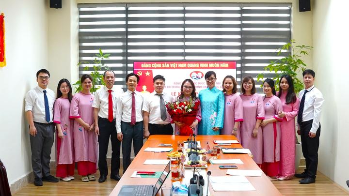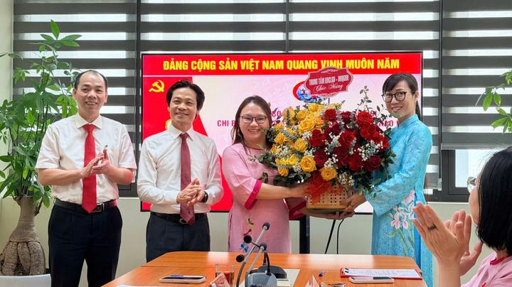 Đại diện Ban chấp hành Công đoàn Viện Đào tạo số và Khảo thí, ĐHQGHN tặng hoa chúc mừng đảng viên mới Nguyễn Thị Hồng Hạnh